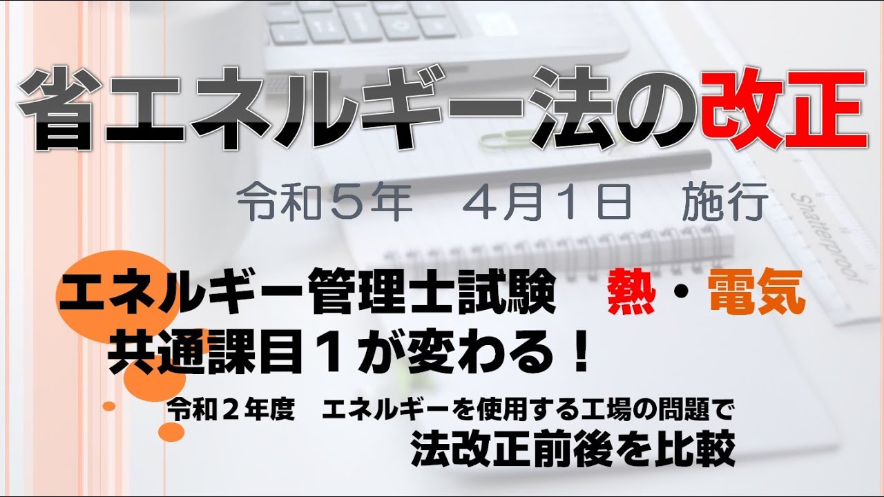 令和5年4月1日より、エネルギー管理士試験課目1で出題されていた”省エネ法”が”改正省エネ法”に法律が改正されます。それに伴い、エネルギー計算の仕方が変わってきますので、その対策を動画で解説しています...