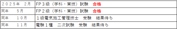 技術士(電気電子)、電験2種、エネルギー管理士(電気)、電験3種、電気工事士1種(認定)、(青字は40歳前後で取得)
