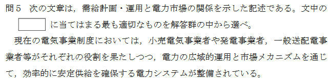 問5は電力広域的運用に関する問題がB問題で出題されました。ただし、主に取引市場の話であり、少し難しかったのではないかと思います。