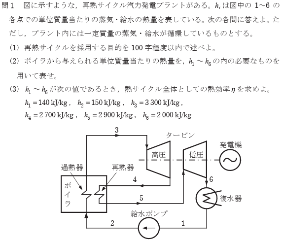問1:再熱サイクル火力発電 15点~20点