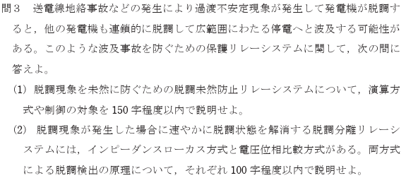 解答は、事前演算方式や事後演算方式について書けばよかったのですが、具体的な脱調予測分離リレーシステムの検出原理と制御対象について説明してしまいました。
