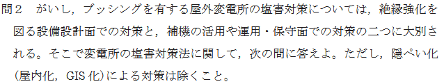 がいしとブッシングの塩害については過去にも出題されていますが、GIS化を除いた、設備設計面、運用・保守面の両方について問われました。