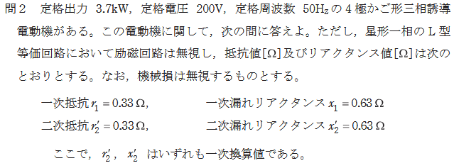 昨年に続き、今年も誘導電動機のトルクに関する問題です。