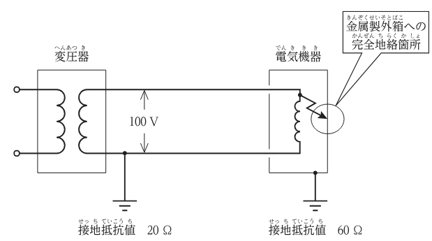 低圧機器の完全地絡時の機器と対地間の電圧を求める問題で、B種接地抵抗値とD種接地抵抗値が与えられています。
